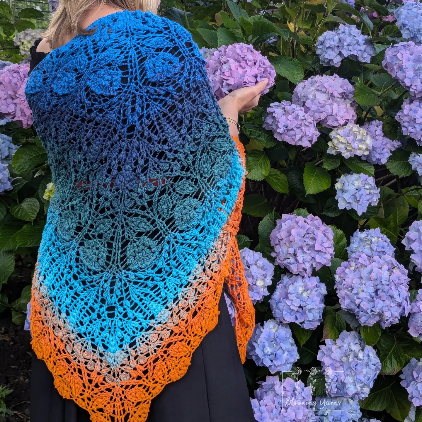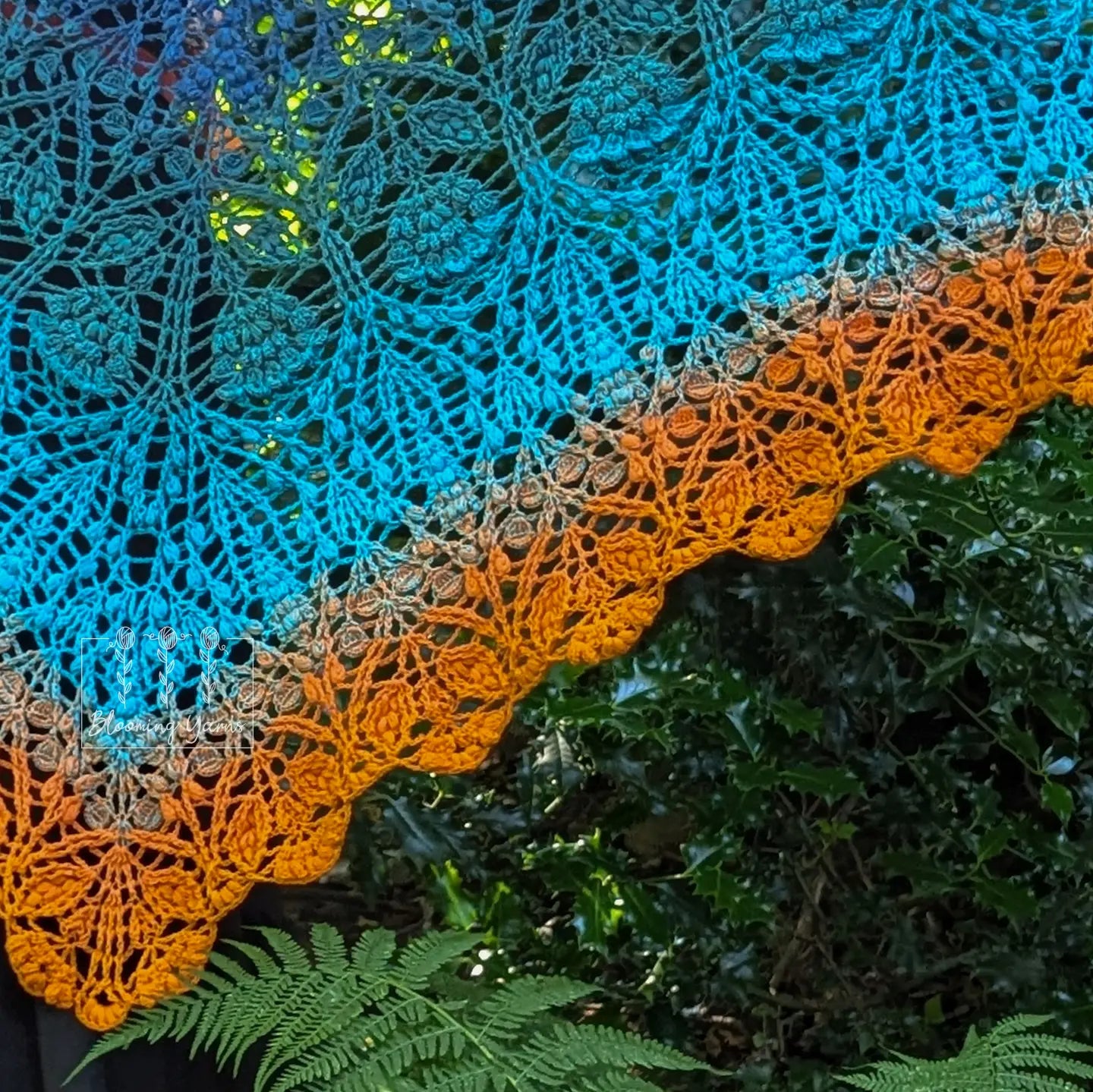 Photos of FOLKLORIA shawl made with 3ply smoothie 1650m , pattern by Kaleo Handmade
