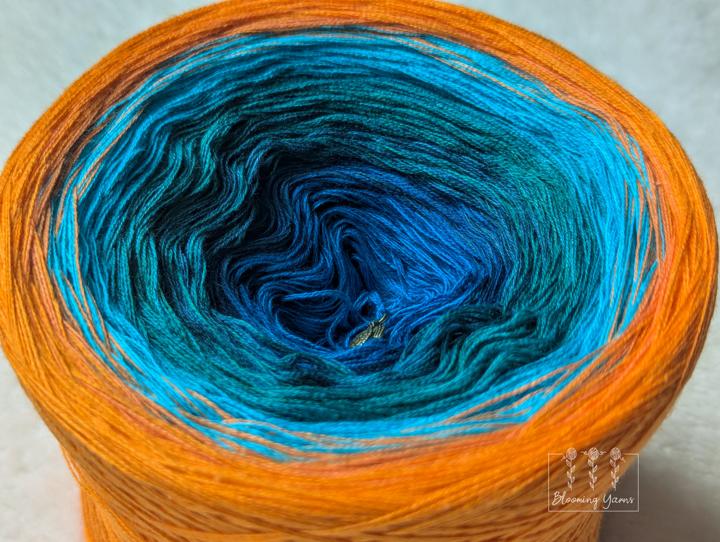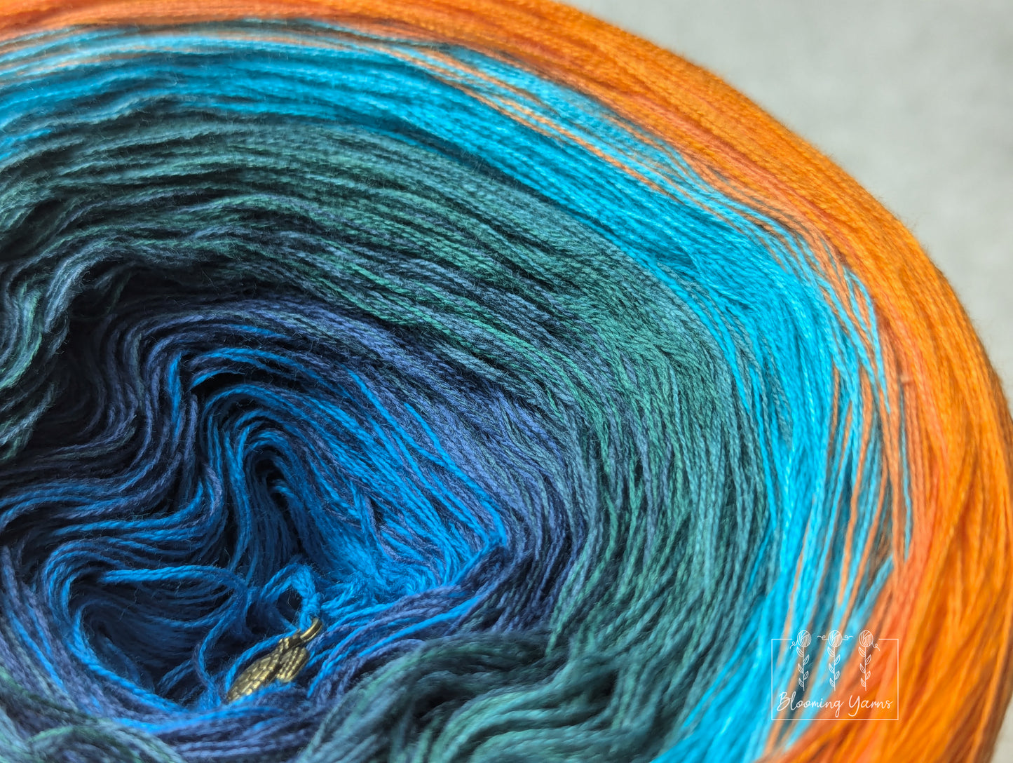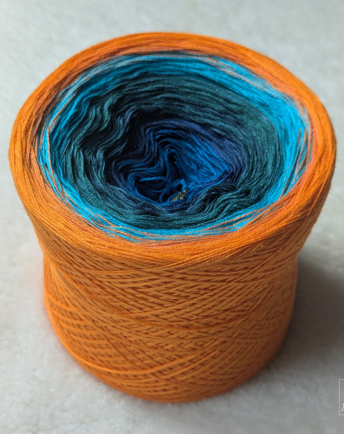 Gradient yarn cake made with 50%cotton/50%HQ acrylic untwisted threads.