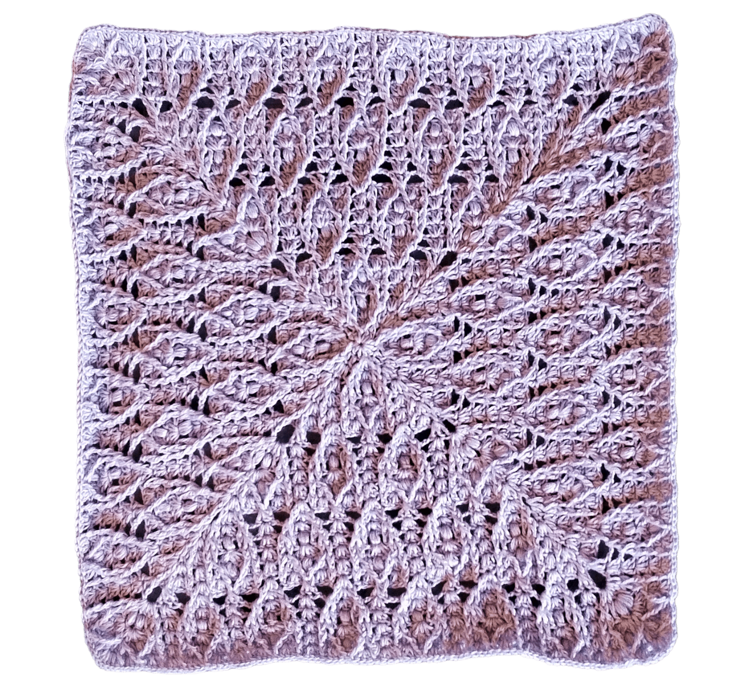 Square from photos is made with 4 repetitions, used around 450m 3ply cotton/acrylic threads, crochet hook 2,5mm. It's 44cm side.