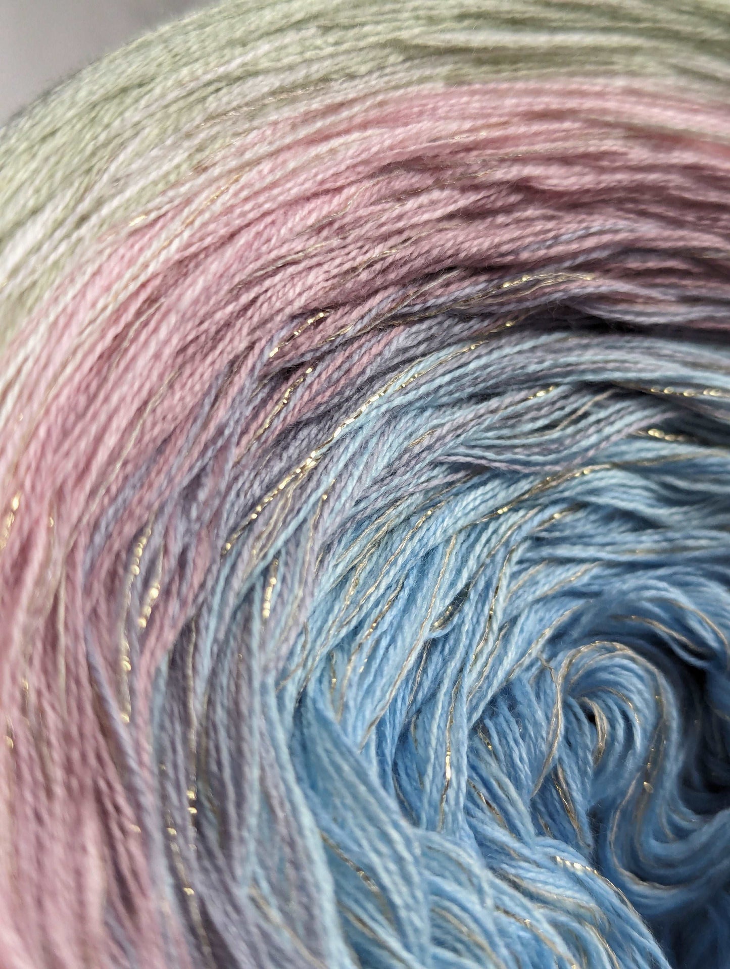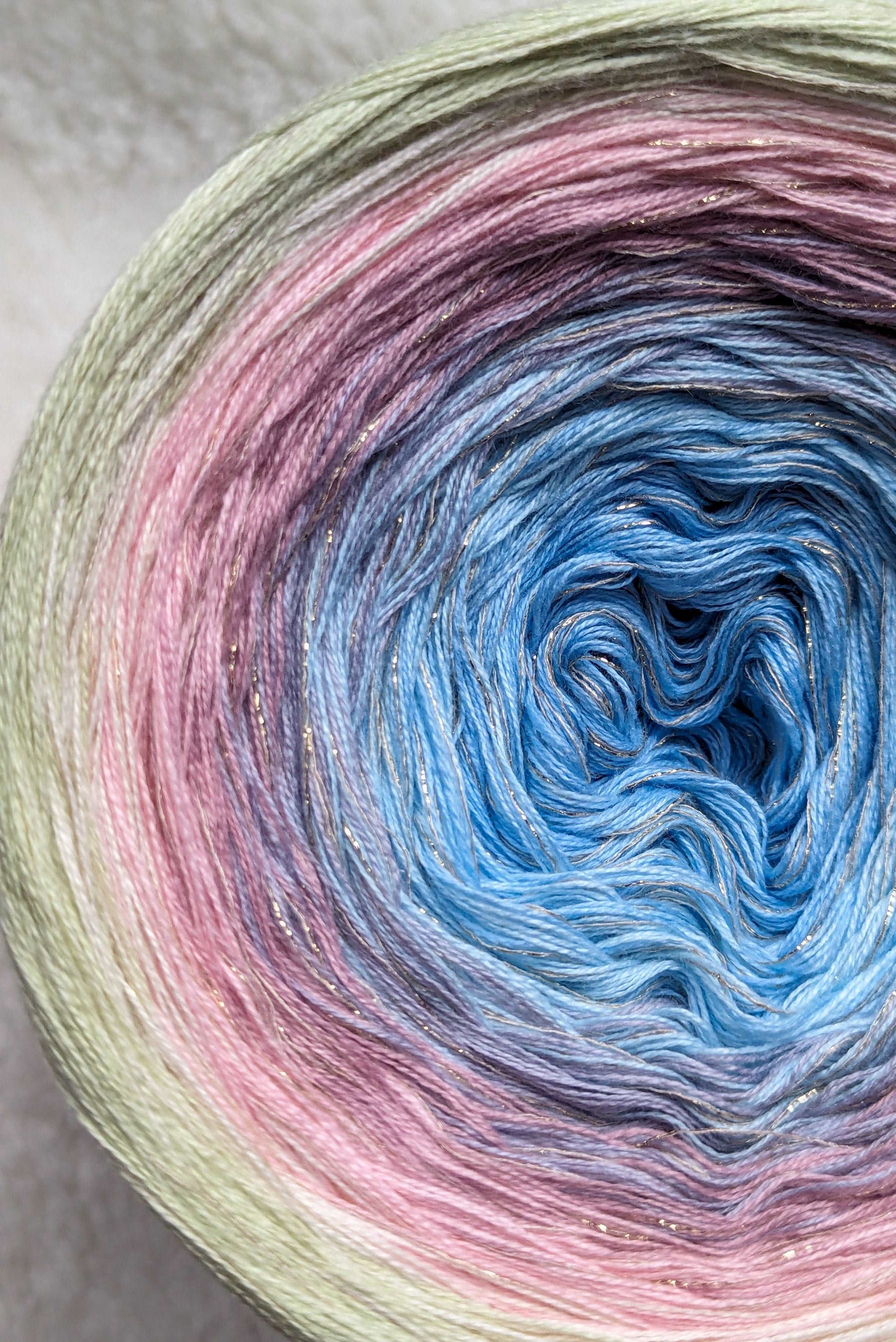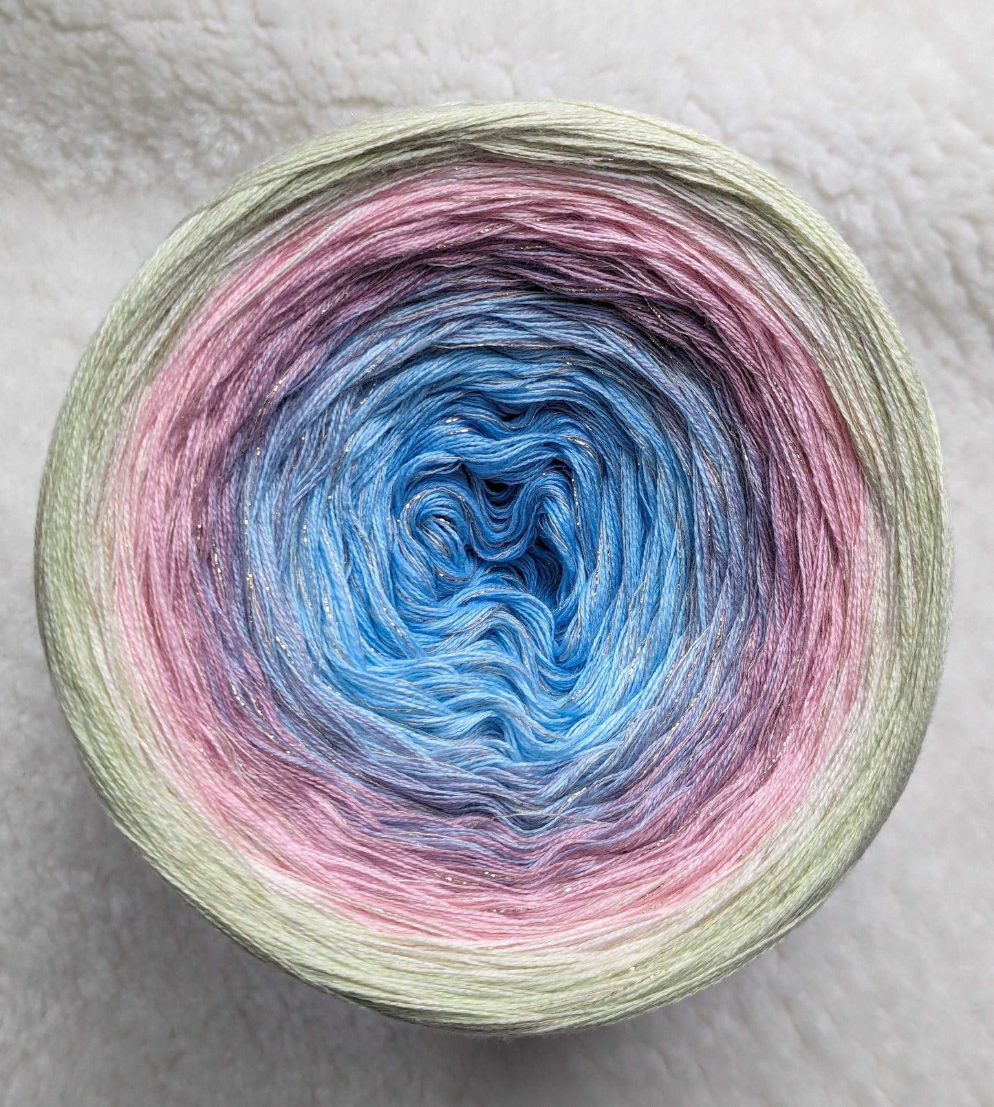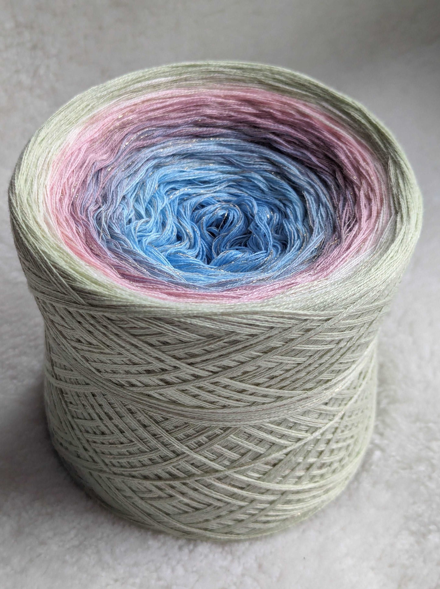 Gradient yarn cake made with 50%cotton/50%HQ acrylic untwisted threads.