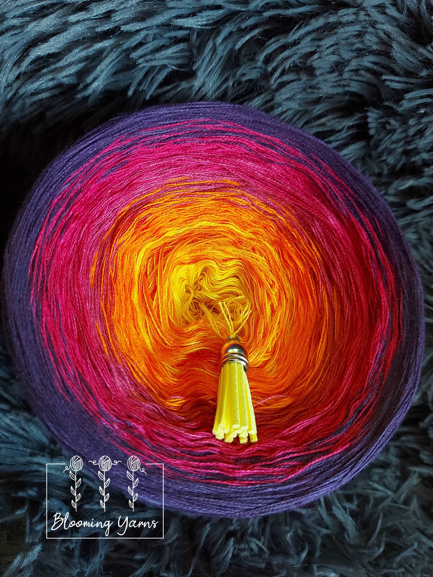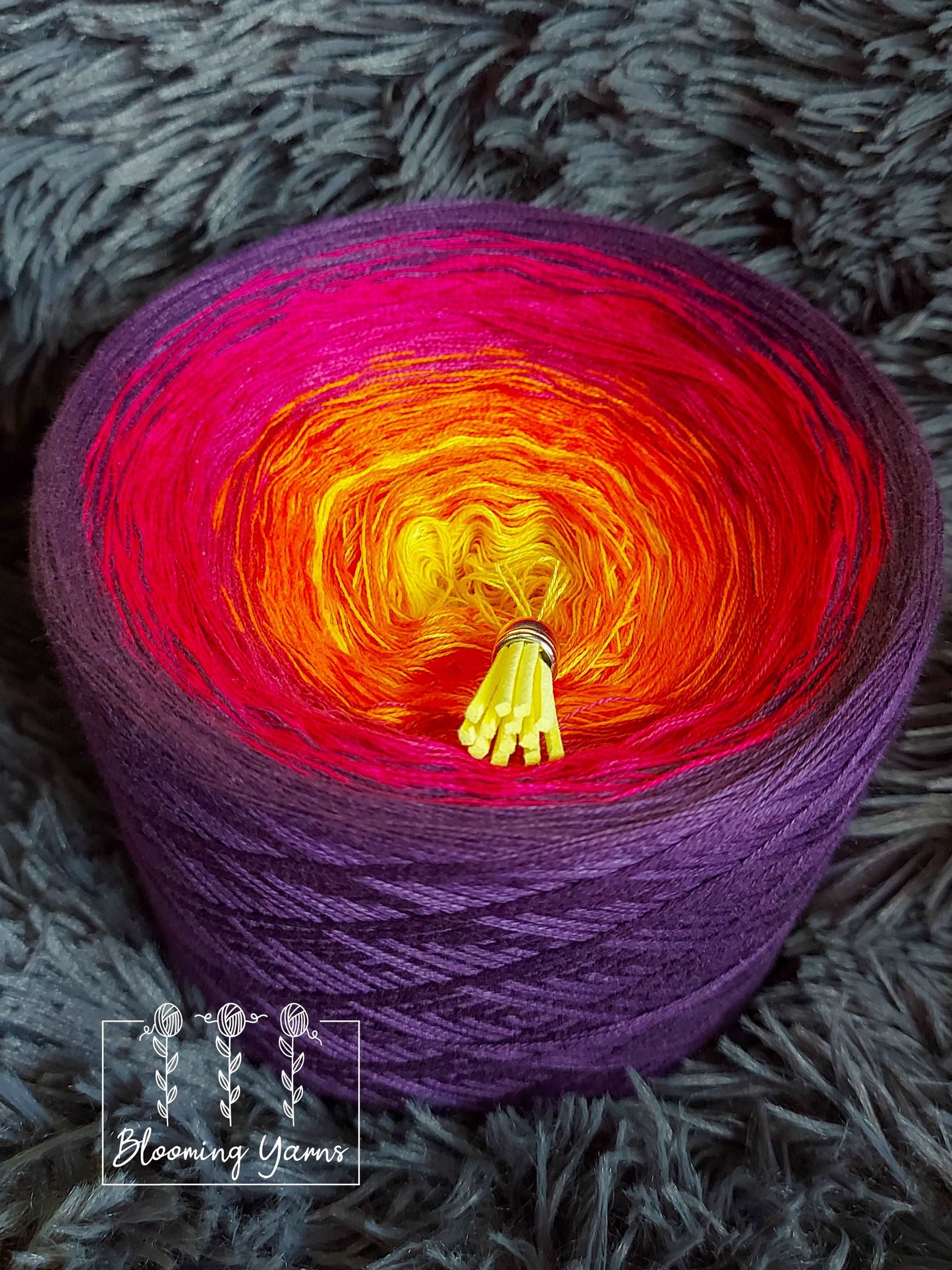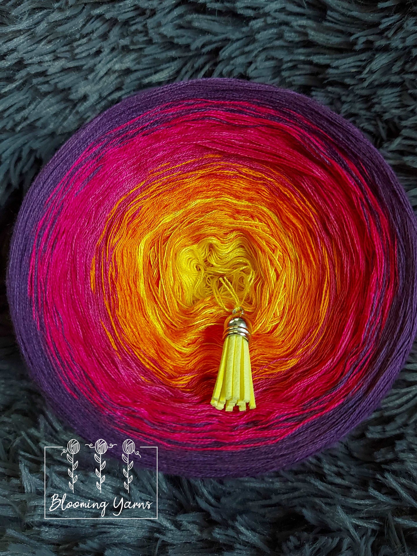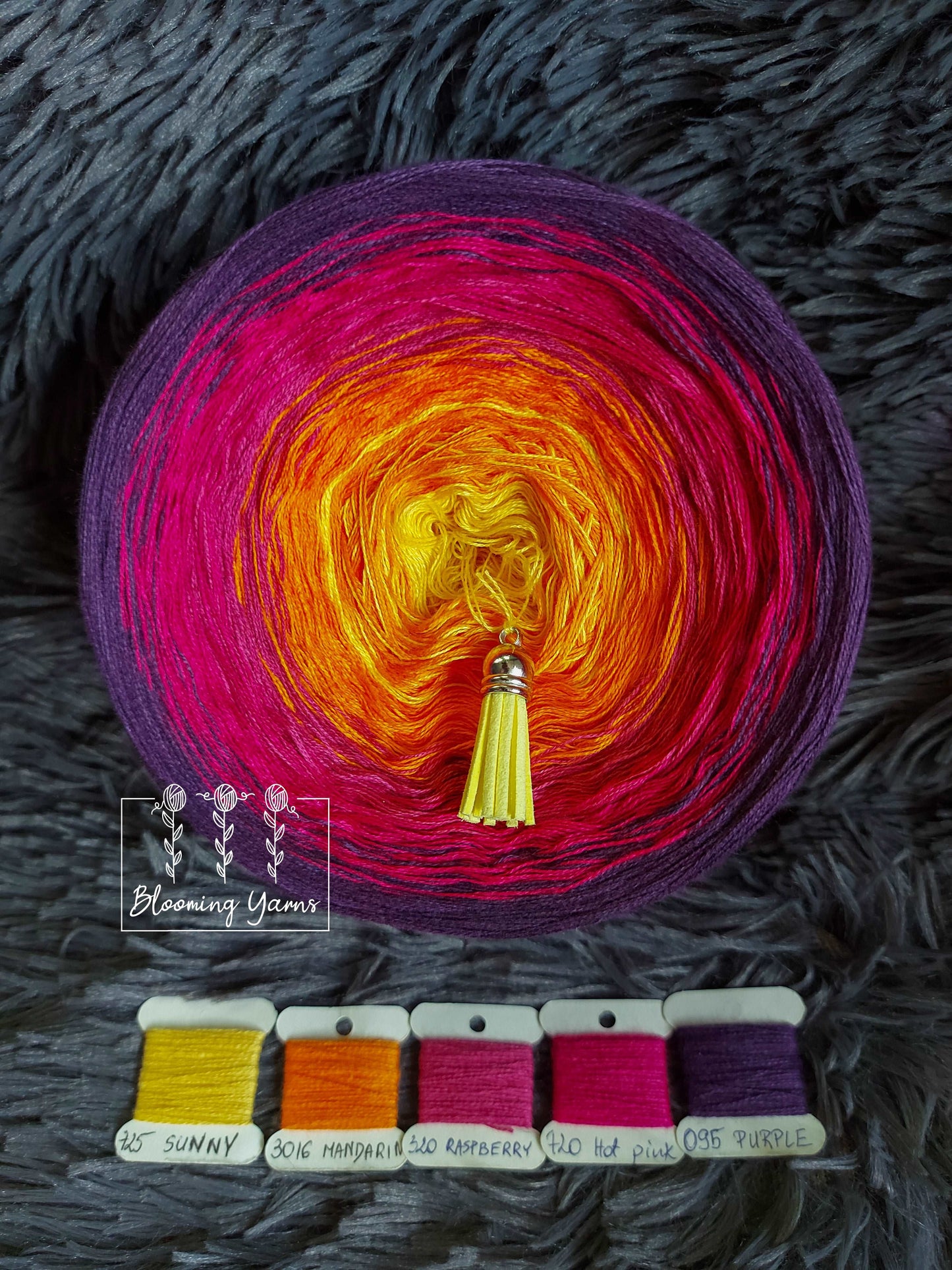 Gradient yarn cake made with 50%cotton/50%HQ acrylic untwisted threads.