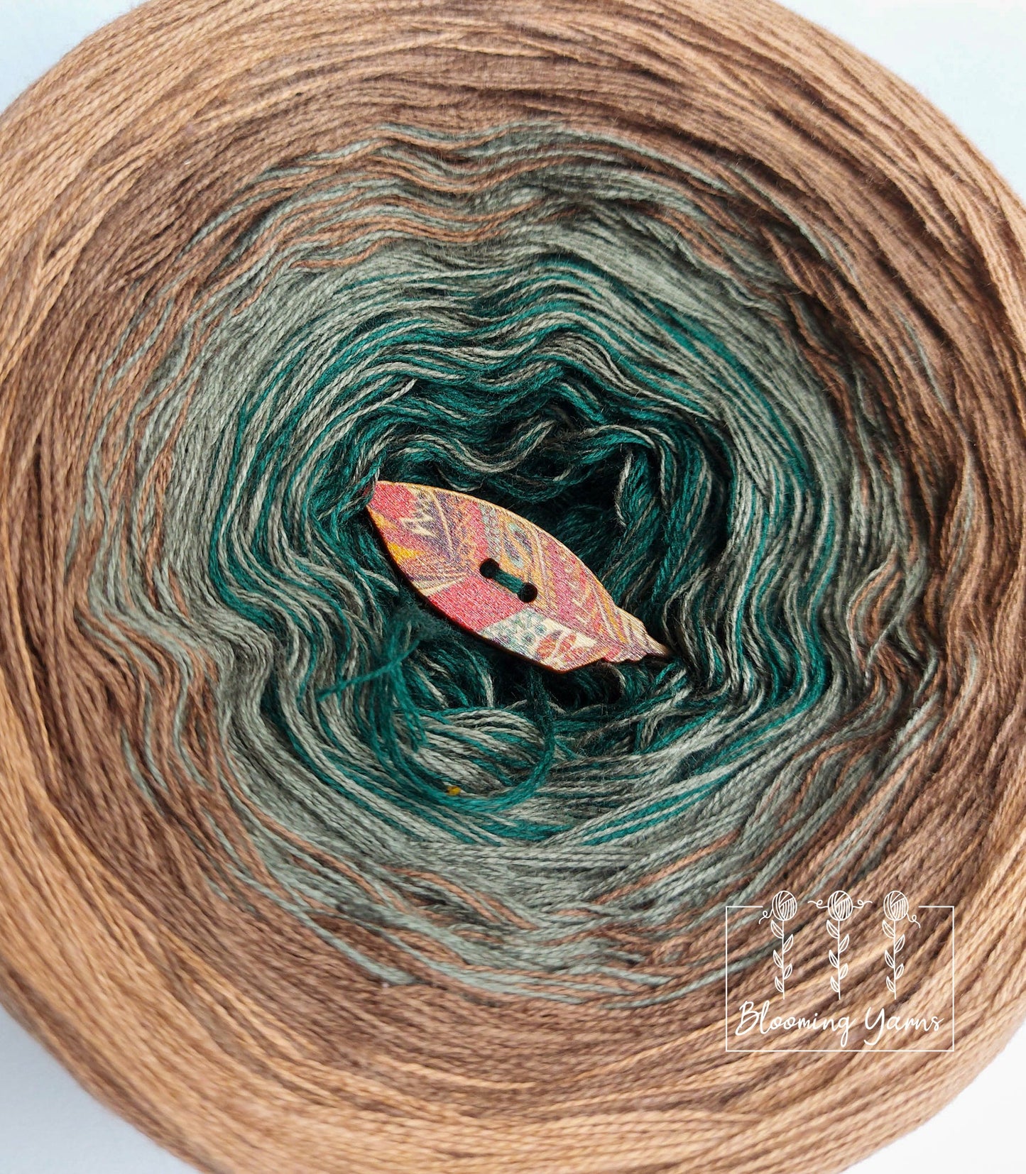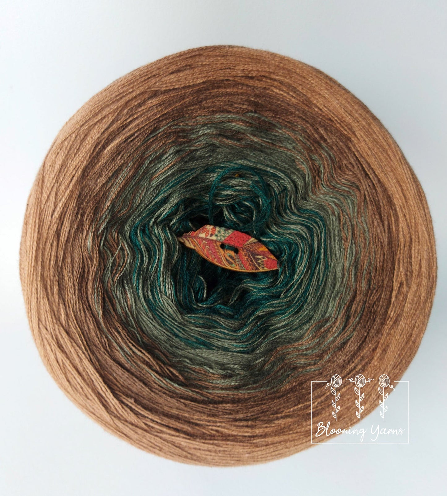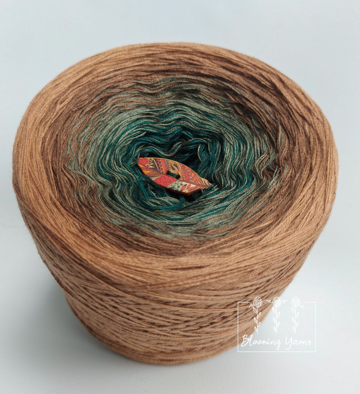 Gradient yarn cake made with 50%cotton/50%HQ acrylic untwisted threads.