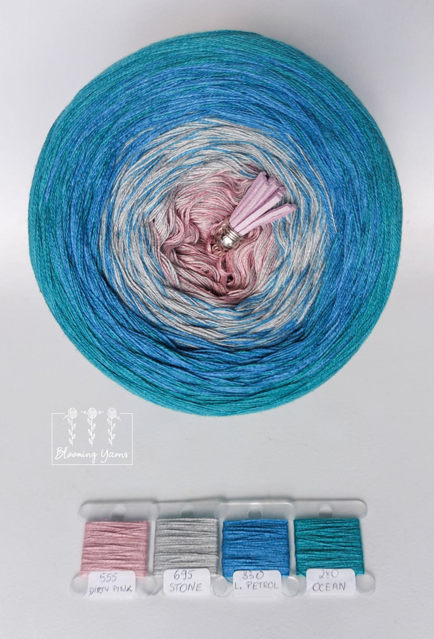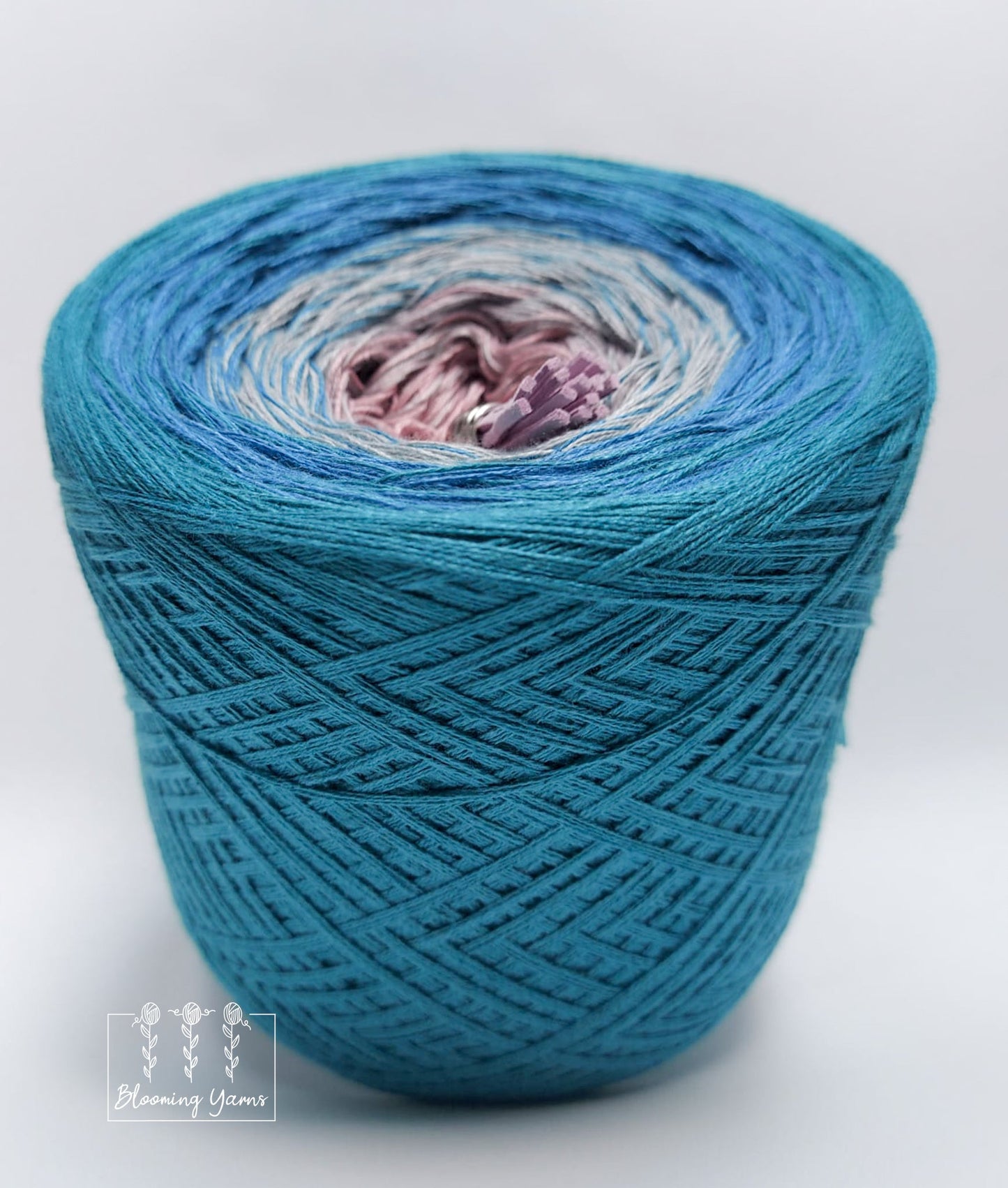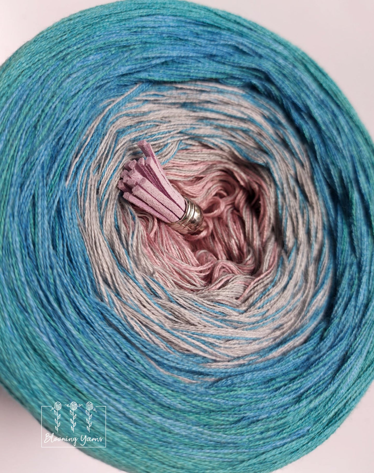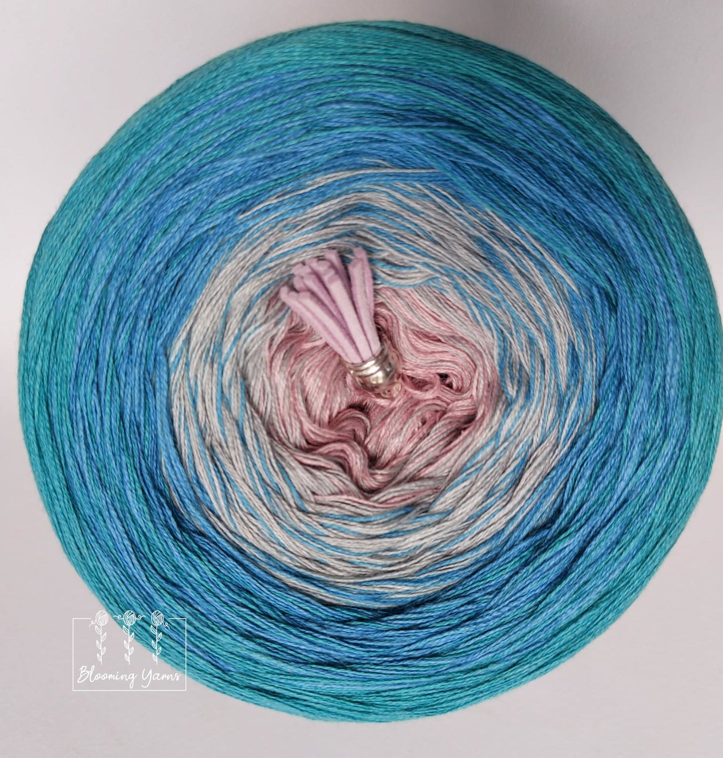 Gradient yarn cake made with 50%cotton/50%HQ acrylic untwisted threads.