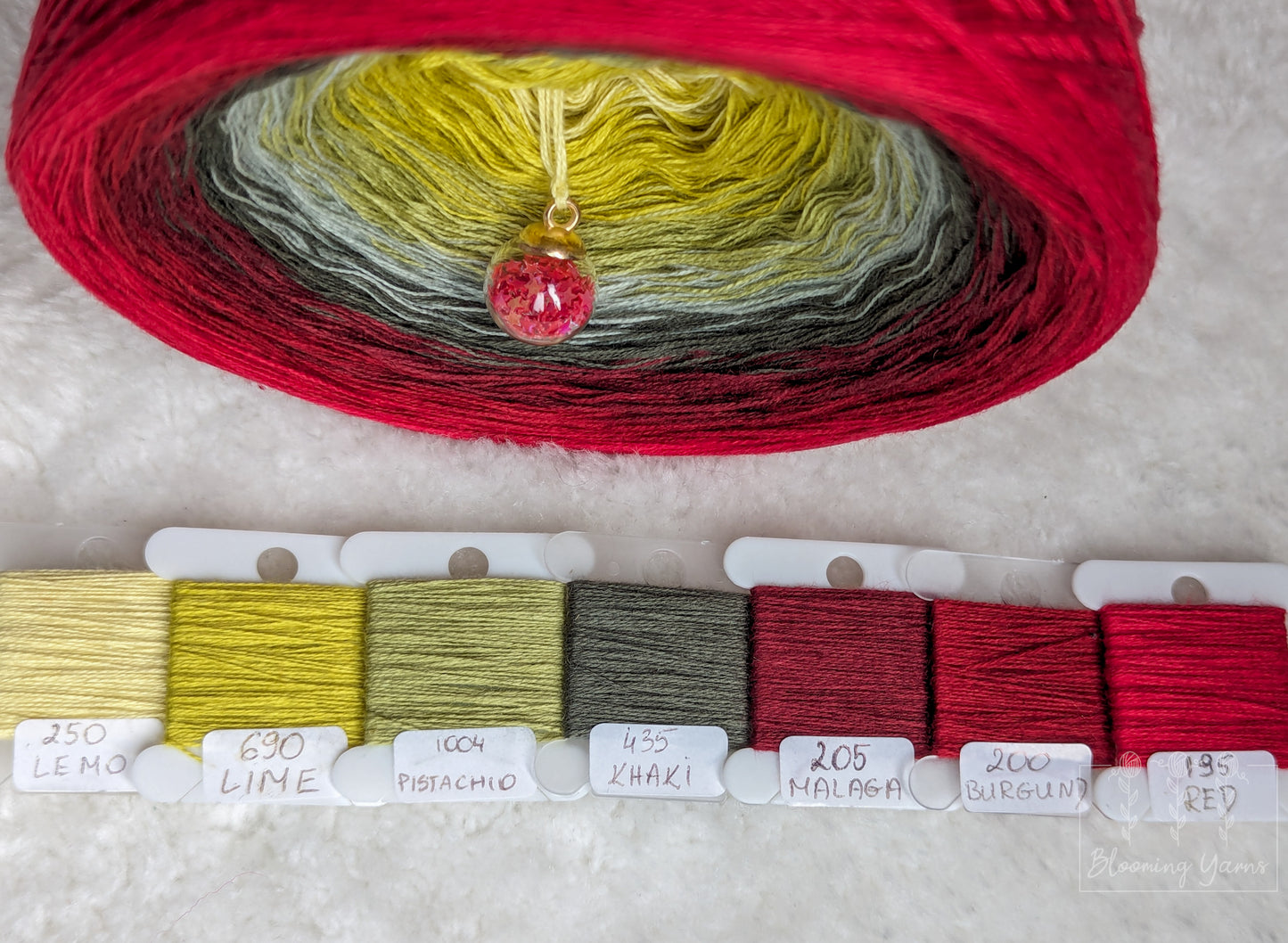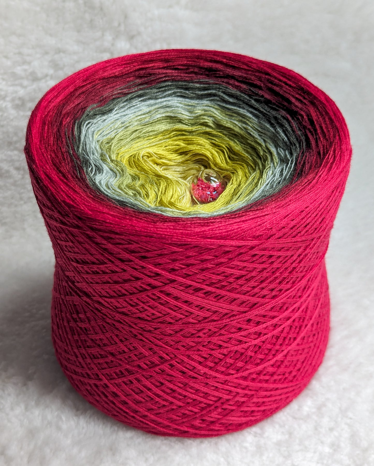 Gradient yarn cake made with 50%cotton/50%HQ acrylic untwisted threads.
