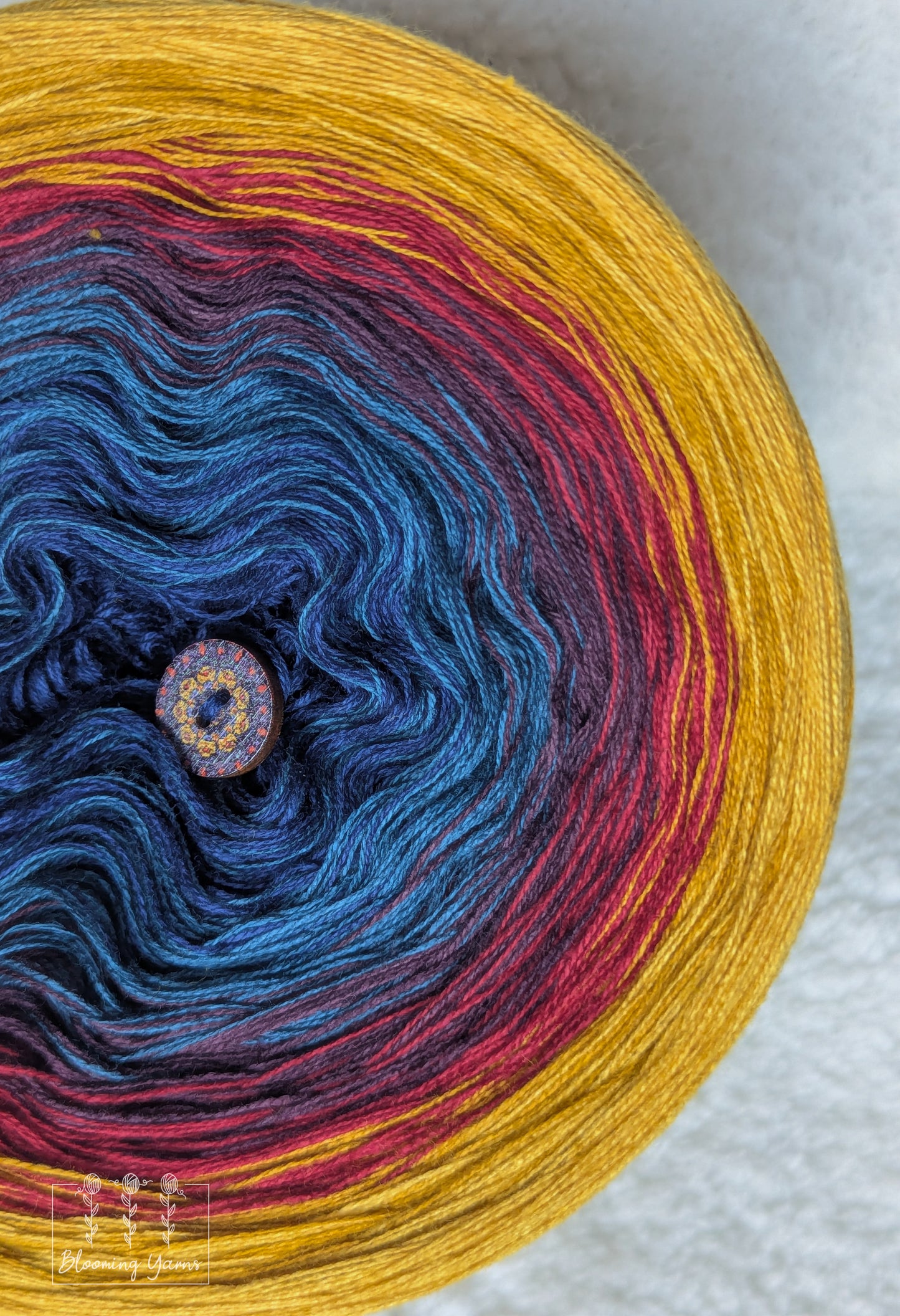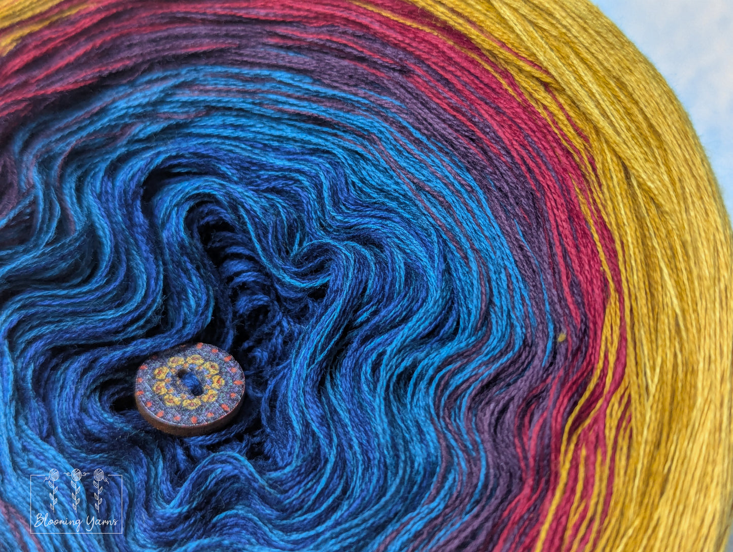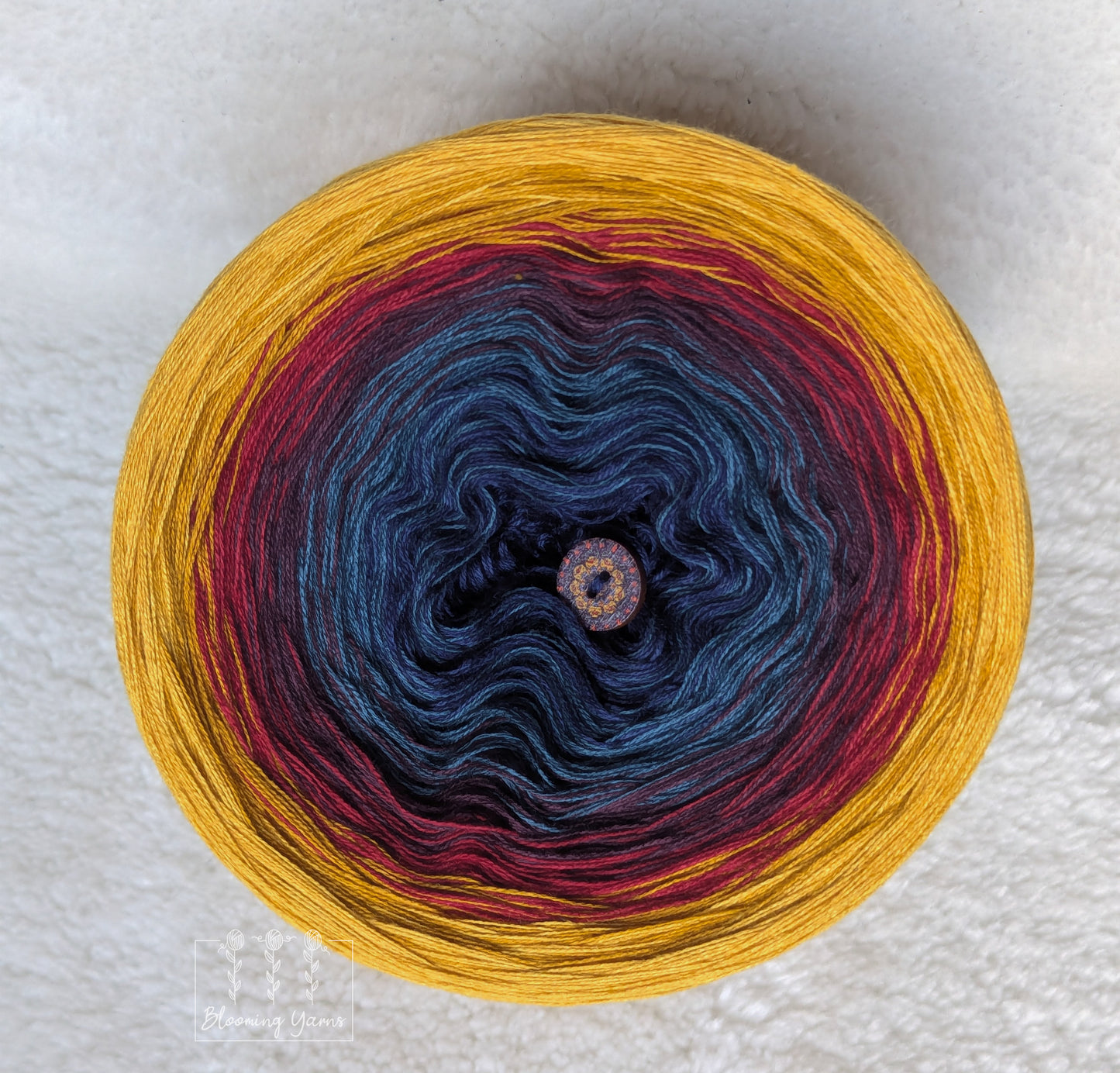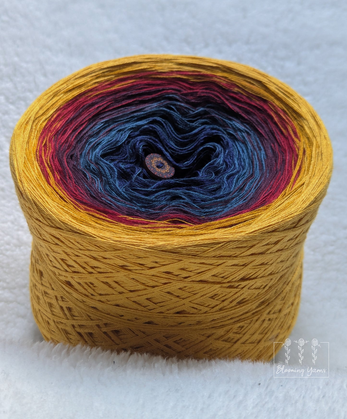 Gradient yarn cake made with 50%cotton/50%HQ acrylic untwisted threads.