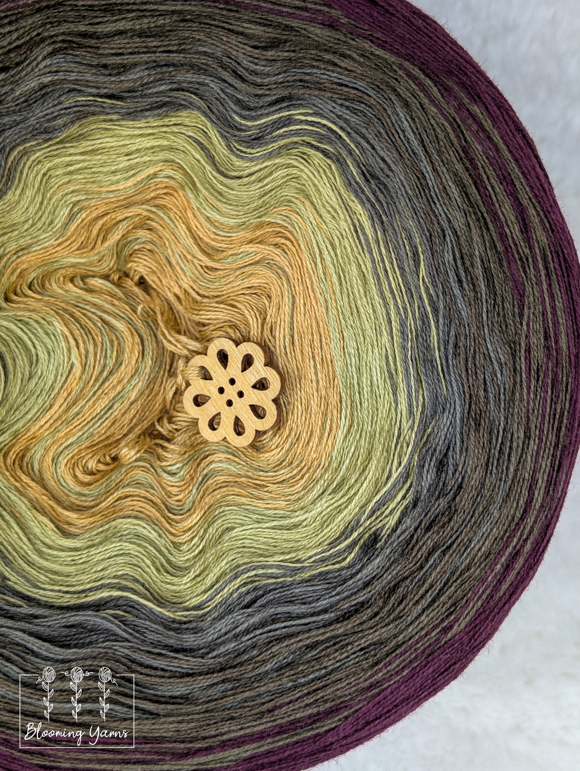 Gradient yarn cake made with 50%cotton/50%HQ acrylic untwisted threads.