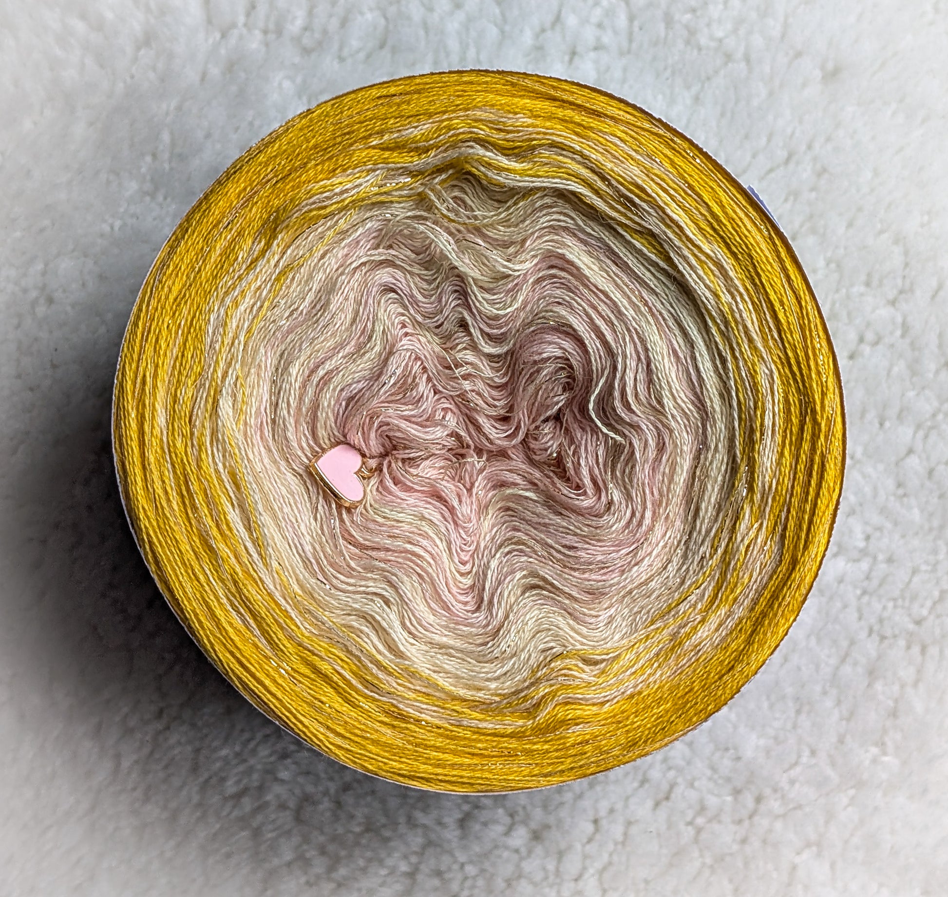 Please remember that yarn cakes with additional threads should be worked from the outside to avoid tangling