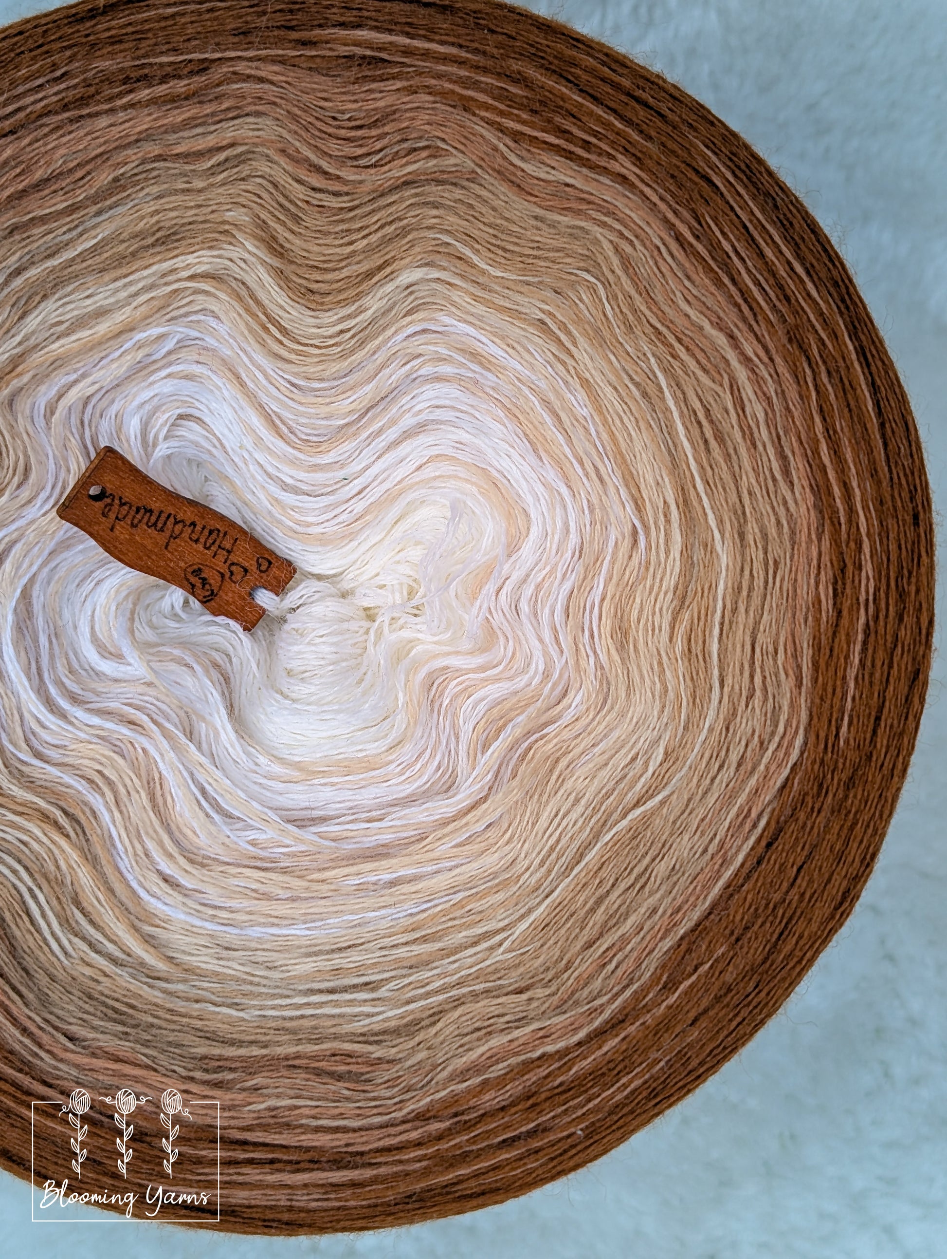 Gradient yarn cake made with 50%merino wool/50%HQ acrylic untwisted threads.
